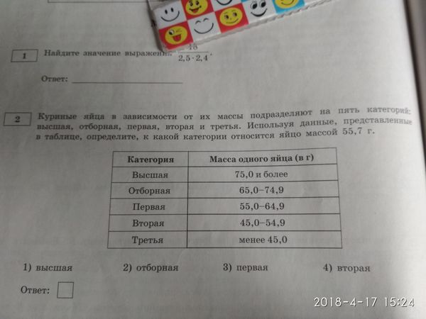 2 Куриные яйца в зависимости от их массы подразделяют на пять категорий: высшая, отборная, первая, вторая и третья. Используя данные, представленные в таблице, определите, к какой категории относится яйцо массой 55,7 г.
