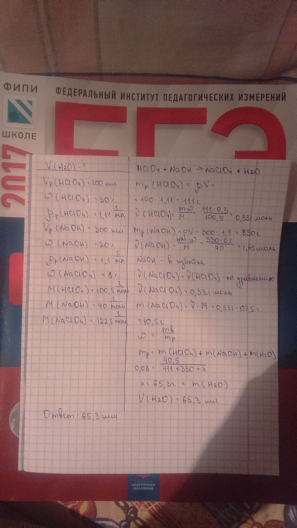 Смешали 100 мл 30%–ного раствора хлорной кислоты (r = 1,11 г/мл) и 300 мл 20%–ного раствора гидроксида натрия (r = 1,10 г/мл). Сколько миллилитров воды следует добавить к полученной смеси, чтобы массовая доля перхлората натрия в ней составила бы 8%?