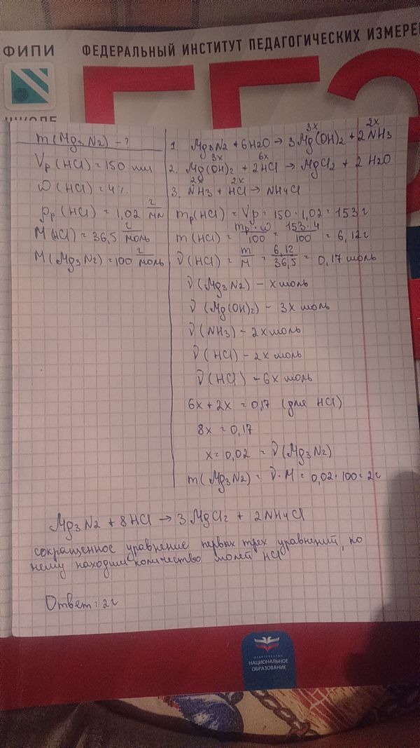 Определите массу Mg3N2, полностью подвергшегося разложению водой, если для солеобразования с продуктами гидролиза потребовалось 150 мл 4%-го раствора соляной кислоты плотностью 1,02 г/мл.