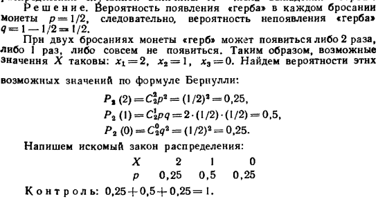 Монета брошена 2 раза. Написать в виде таблицы закон распределения случайной величины X — числа выпадений «герба».