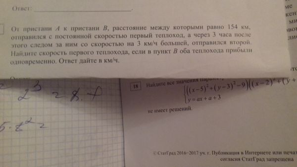 От пристани A к пристани B, расстояние между которыми равно 154 км, отправился с постоянной скоростью первый теплоход, а через 3 часа после этого следом за ним со скоростью на 3 км/ч большей отправился второй. Найдите скорость первого теплохода, если в пункт B оба теплохода прибыли одновременно. Ответ дайте в км/ч.