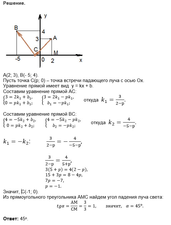 отразился от нее и прошел через точку В(-5; 4). Найти угол а.