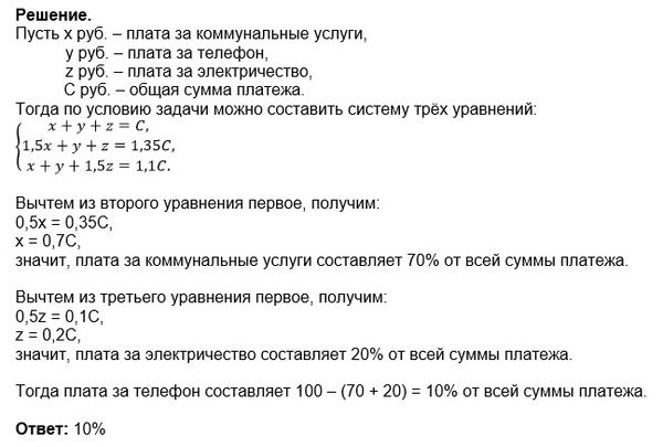 При удорожании коммунальных услуг на 100%, общая сумма увеличилась бы на 70%. А если бы электричество подорожало на 100%, то общая сумма платежа увеличилась бы на 20%. Значит, в общем платеже на коммунальные услуги приходится 70%, а на электричество — 20%. Поэтому на телефон приходятся оставшиеся 10%.