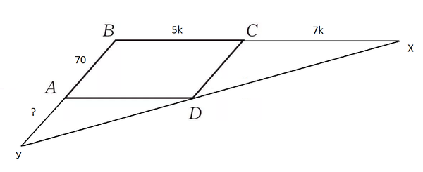 на стороне параллелограмма abcd отметили точку x так чтобы bc : xc = 5:7 , и через точки d и x провели прямую , которая пересекает прямую, ab в точке y . найдите отрезок by, учитывая что сторона ab = 70 мм.