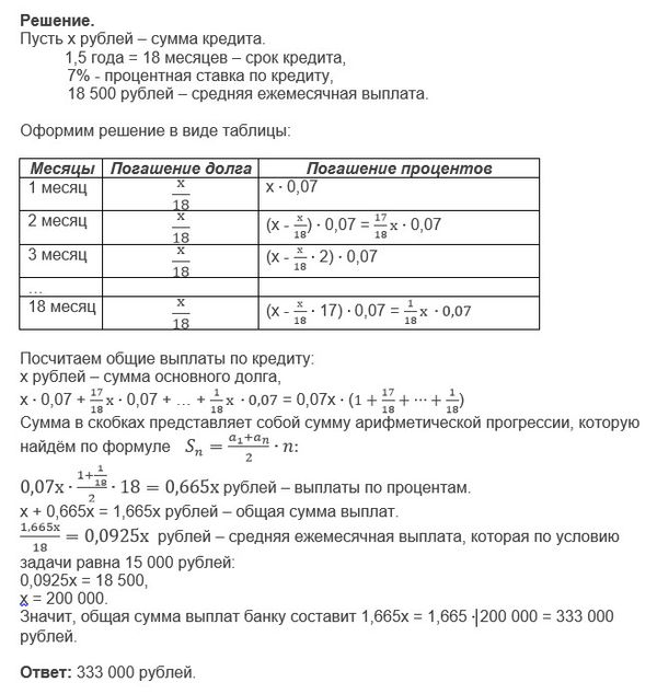 Какую сумму надо выплатить банку, если средняя ежемесячная выплата за весь срок кредитования будет равна 18 500 рублей?