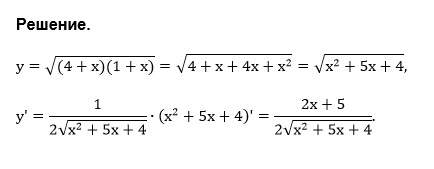 1) y = sqrt((4 + x)(1 + x)). Найти y'.
