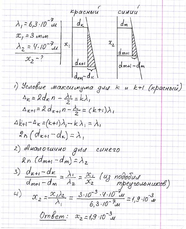 (λ2 = 400 нм). Найдите расстояние ℓ2 между соседними синими