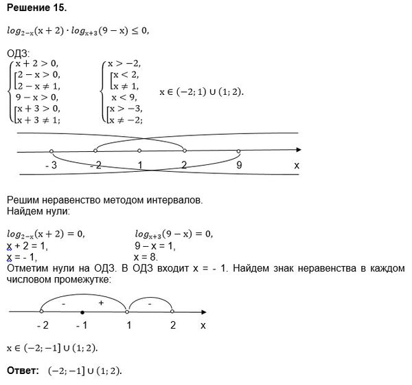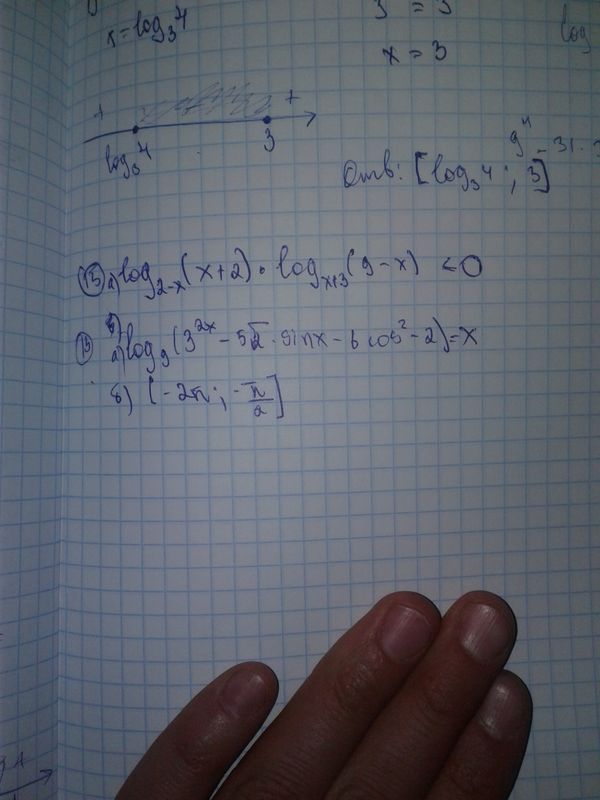 15) log(2-x)(x+2) * log(x+3)(9-x) меньше или равно 0 13) log9(3^(2x)-5sqrt(2)sinx-6cos^2x-2) = x, [-2Pi; -Pi/2]