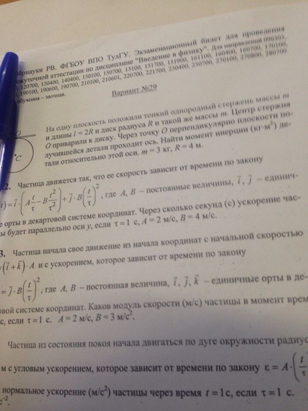 на одну плоскость положили тонкий однородный стержень массы m и длины l=2r и диск с радиусом R и такой же массы m. Центр стрежня O приварили к диску. Через точку O перпендикулярно плоскости получившейся детали проходит ось. Найти момент инерции (кг*м2) детали относительно этой оси, m=3кг, R=4м