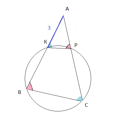 Точка A, лежащая вне окружности , соединена с концами хорды BC этой окружности. Отрезки AB и AC пересекают окружность соответственно в точках K и P, отличных от B и C. K лежит между A и B,а P между Aи C. Найдите длину отрезка KP, если KA=3 и AC больше BC в 4/3 раза