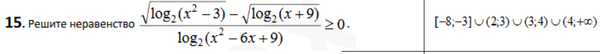 (sqrt(log2(x^2-3))-sqrt(log2(x+9)))/log2(x^2-6x+9) больше или равно 0