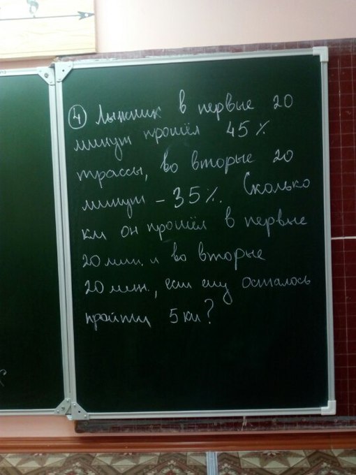 1) 100% - (45% + 35%) = 20% = 0,2 трассы осталось пройти.