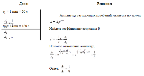 Амплитуда затухающих колебаний математического маятника за времени t = 1мин. уменьшилась вдвое. Во сколько раз уменьшится амплитуда за время t = 3 мин?