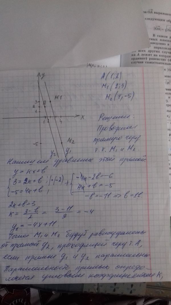 4.2.65) Найти уравнение прямой, проходящей через точку А(1;2) так, чтобы расстояние от этой прямой до точек M1(2; 3) и М2(4; -5) были бы равны.