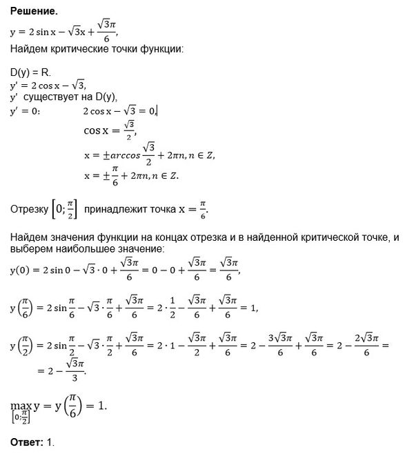 найдите наибольшее значение функции y=2sin x-√3x+√3π÷6 на отрезке [0;π÷2]