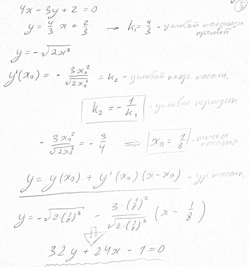 В какой точке кривой y=-sqrt(2x^3) касательная перпендикулярная прямой 4x-3y+2=0? Найти уравнение касательной в этой точке.