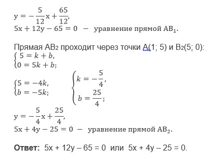 4 .2 .72. Написать уравнение прямой, проходящей через точку A(1; 5) на расстоянии пяти единиц от начала координат.