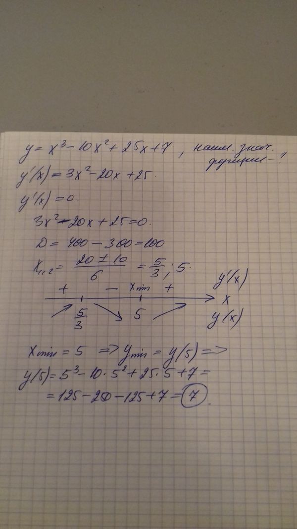 найдите наименьшее значение функции у=х^3-10х^2+25х+7