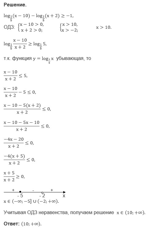log(1/5)(x-10)-log(1/5)(x+2) больше или равно -1