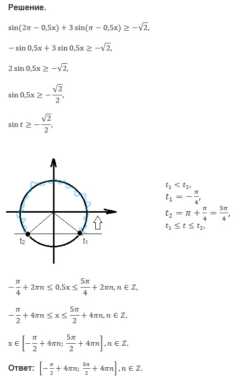 По формулам приведения sin(2pi-x/2)=-sin(x/2); sin(pi-x/2)=sin(x/2). получаем -sin(x/2)+3sin(x/2) > =-sgrt(2). 2sin(x/2) > =-sgrt(2); sin(x/2) > =-sgrt(2)/2 -pi/4+2pik < =x/2 < =3pi/4+2pik. k-целое число. -pi/2+4pik < =x < =3pi/2+4pik. k-целое число. Это ответ.