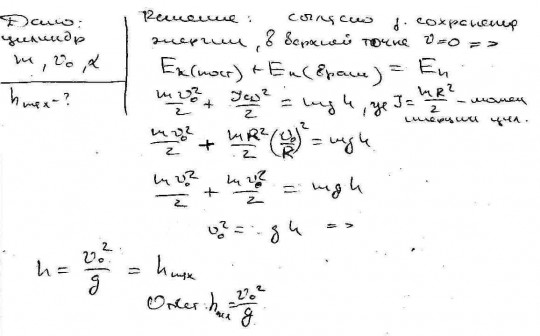 Цилиндр массой m у основания наклонной плоскости с углом наклона a имеет скорость движения v. На какую максимальную высоту может подняться этот цилиндр, двигаясь без скольжения?