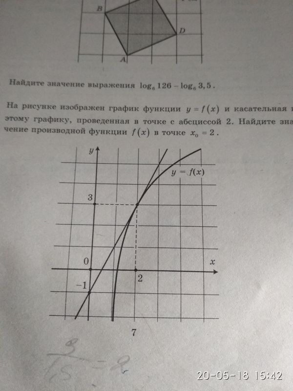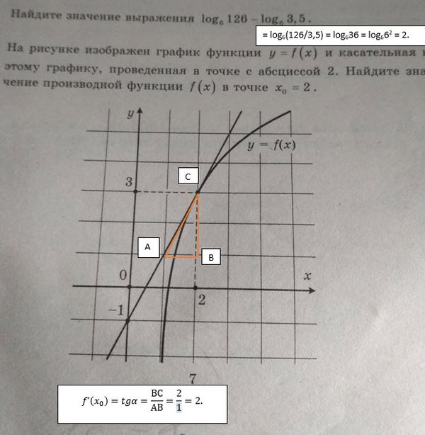 Найдите значение выражения log6 126 - log6 3,5. На рисунке изображен график функции y = f(x) и касательная к этому графику, проведенная в точке с абсциссой 2. Найдите значение производной функции f(x) в точке х₀ = 2.