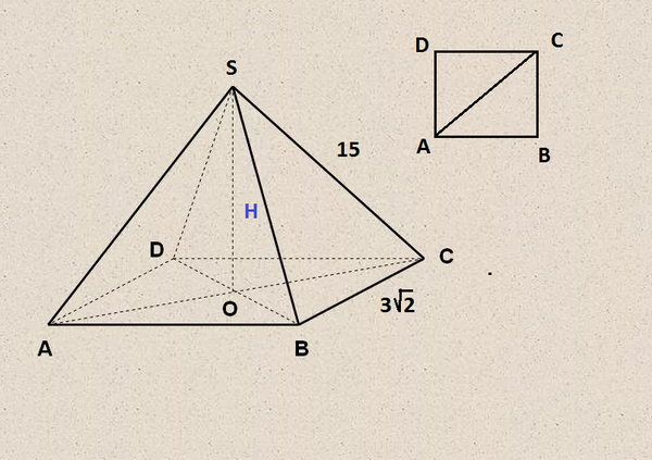 АС=3sqrt(2)*sqrt(2)=6 - диагональ квадрата со стороной 3sqrt(2) OC=(1/2)AC=3 По теореме Пифагора SO^2=SC^2-OC^2=15^2-3^2=216 H=SO=sqrt(216)=6sqrt(6) V=(1/3)*S(осн.)*Н=(1/3)*(3sqrt(2))^2*6sqrt(6)=36sqrt(6)
