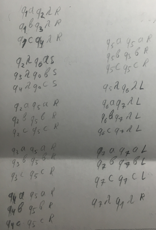 Надо оставить только средний символ. Алфавит = {a, b, c}. Слово нечетной длины. Код для Машины Тьюринга.