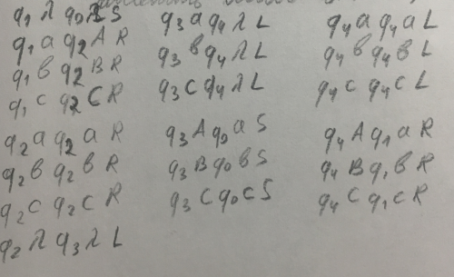 Надо оставить только первую половину слова. Слово состоит из четного числа символов. Алфавит = {a, b, c}. Код для Машины Тьюринга.