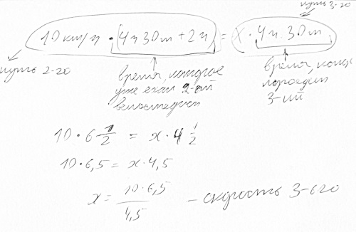 Один велосипедист выехал со скоростью 16 км/ч, через час после него из того же поселка в том же направлении выехал второй со скоростью 10 км/ч, ещё через час выехал третий. Он догнал второго и через 4 ч. 30 мин после этого догнал первого велосипедиста.Найти скорость третьего?