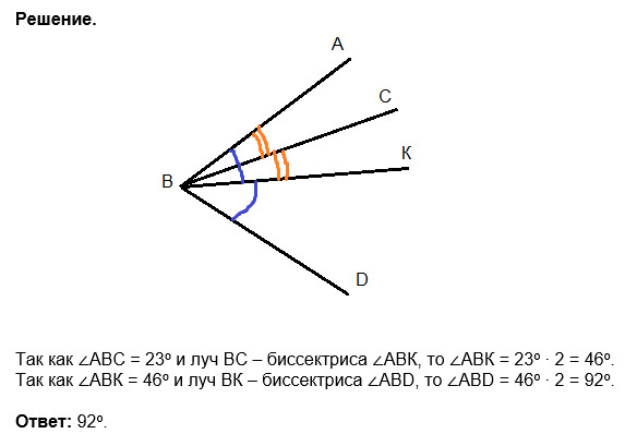 ЛУЧ ВК -биссертриса угла АВD,луч ВС-биссертриса угла АВК .Угол АВС =23*.Найти угол АВD.