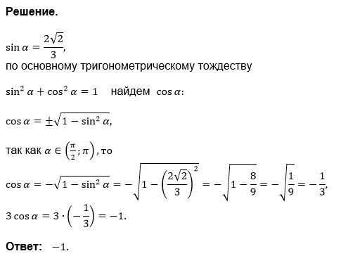 сos альфа =-sqrt(1-(2sqrt(2/3))^2)=-sqrt(1-(8/9))=-sqrt(1/9)=-1/3