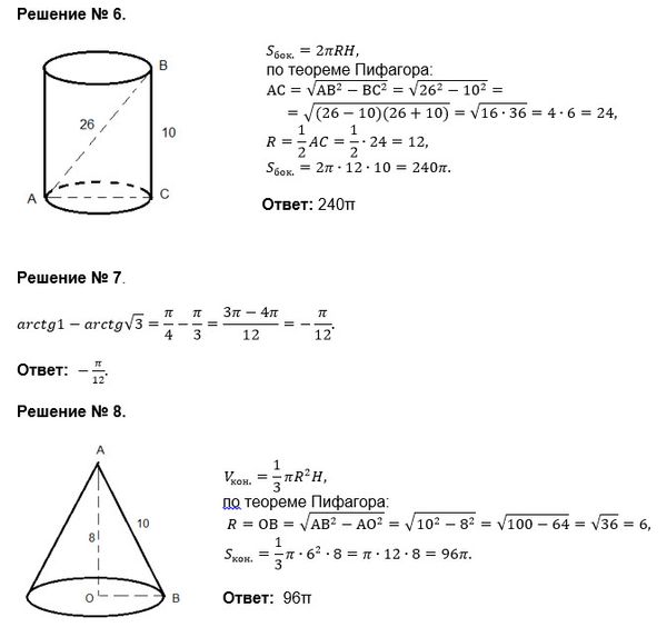 6. Диагональ осевого сечения цилиндра равна 26 см., высота – 10см. Найти площадь боковой поверхности цилиндра. 7. Вычислить: arctg 1 – arctg √3 ; 8. Образующая конуса 10см, высота - 8см. Найти объем конуса.