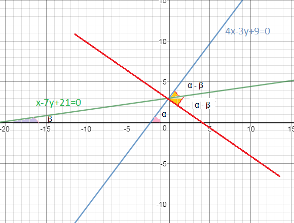 x–7y+21=0 ⇒ y=(1/7)x+3 ⇒ tg бета =1/7