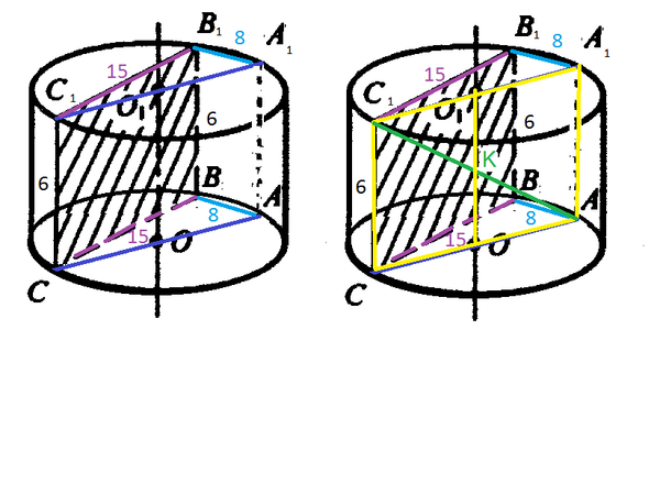Аналогично прямая АО пересекается с окружностью нижнего основания в точке С.
