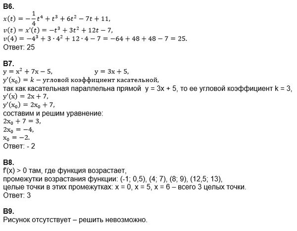 В6. Материальная точка движется прямолинейно по закону [m]x(t) = \frac{1}{4} t^4 + 3t^3 + 6t^2 + 7t + 11[/m] (где [m]x[/m] — расстояние от точки отчета в метрах, [m]t[/m] — время в секундах, измеренное с начала движения). Найдите её скорость (в м/с) в момент времени [m]t = 4с[/m].