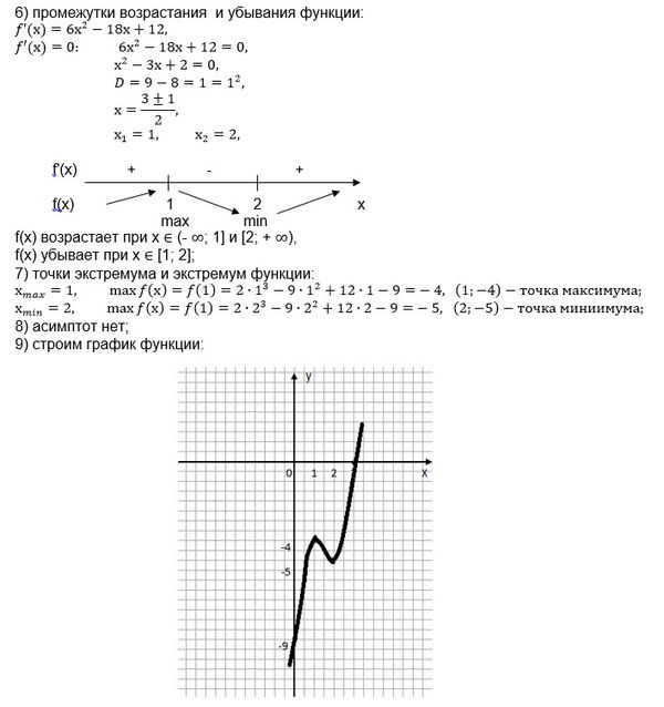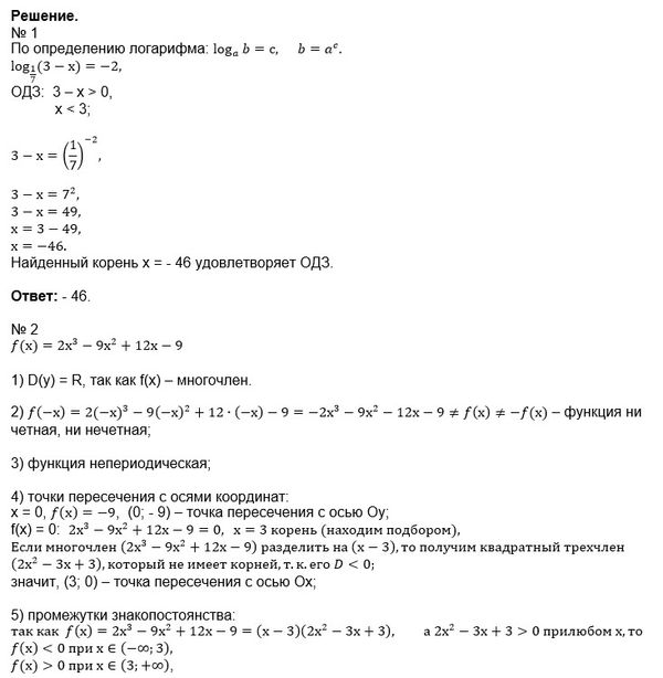 Здравствуйте , Помогите решить. Желательно обьяснить мне эту задачу по какой формуле , надо это брать . 1) Найти корень уравнения log_(1/7)(3-x)=-2 2) Построить график функции y=f(x) , используя общую схему исследования функции y=2x^3-9x^2+12x-9 .