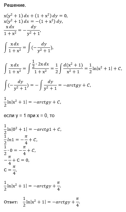 x(y^2+1)dx+(1+x^2)=0; если у=1 при х=0...