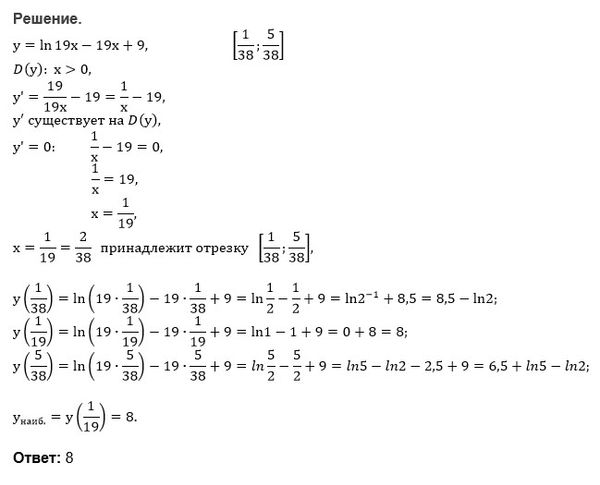 Найдите наибольшее значение функции y=ln(19x)−19x+9 на отрезке [138;538].