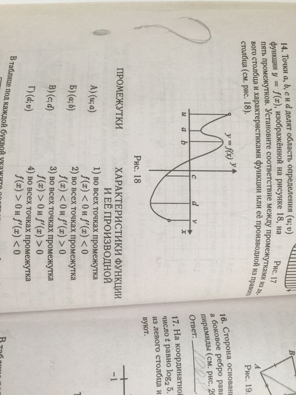 14. Точки a, b, c и d делят область определения функции y = f(x), изображённой на рисунке 18, на пять промежутков. Установите соответствие между промежутками из левого столбца и характеристиками функции и её производной из правого столбца (см. рис. 18).