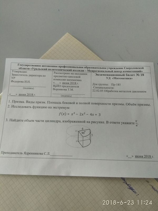 3. Найдите объем части цилиндра, изображенной на рисунке. В ответе укажите [m] \frac{V}{\pi} [/m]