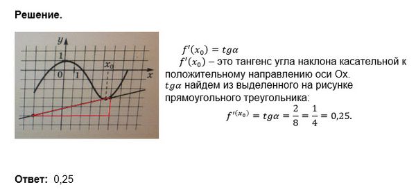 f`(x_(o))=k(касательной)=tg альфа , альфа - угол наклона касательной tg альфа легко найти из прямоугольного треугольника. tg альфа =2/8=1/4 О т в е т. f`(x_(o))=1/4