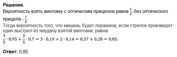 92. В пирамиде пять винтовок, три из которых снабжены оптическим прицелом. Вероятность того, что стрелок поразит мишень при выстреле из винтовки с оптическим прицелом, равна 0,95; для винтовки без оптического прицела эта вероятность равна 0,7. Найти вероятность того, что мишень будет поражена, если стрелок произведет один выстрел из наудачу взятой винтовки*