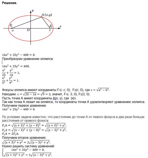 4.3.40) Найти координаты точек эллипса 16x^2+25y^2-400=0, для которых расстояние от левого фокуса в два раза больше расстояния от правого фокуса.