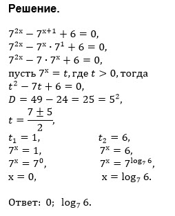 Замена переменной 7^(x)=t t > 0 7^(2x)=(7^(x))^2=t^2 t^2-7t+6=0 D=49-24=25 t=1 или t=6 Обратная замена 7^x=1 ⇒ 7^x=7^0 ⇒ x=0 или 7^x=6 ⇒ x= log_(7)6 О т в е т. 0; log_(7)6