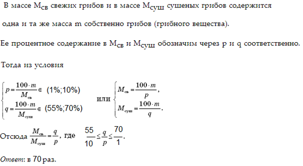 15.21) В свежих грибах содержание воды колеблется от 90% до 99%, а в сушеных — от 30% до 45%. В какое наибольшее число раз при этих ограничениях может уменьшиться вес грибов в результате сушки?
