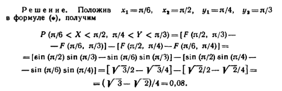 Найти вероятность попадания случайной точки (X; Y) в прямоугольник, ограниченный прямыми х = п/6, х = п/2, у=п/4, у = п/3, если известна функция распределения