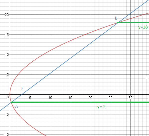 Прямая, проходящая через точку F имеет угловой коэффициент k=3/4