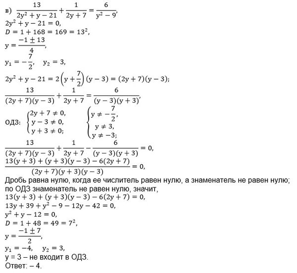 Решите уравнение: а) ((35x)/(4+10x-6x^2)) - ((x+2)/(3x+1))+((3x-1)/(x-2)). б) ((25x-21)/(2x^2+5x-12)) + ((2x-3)/(x+4)) +((x+4)/(3-2x)). в) ((13)/(2y^2+y-21))+ ((1)/(2y+7))= (6)/(y^2-9). г) ((x+9)/x^2-3x-10)) - ((x+15)/(x^2-25))=(1)/(x+2).