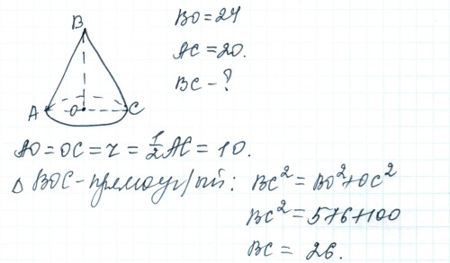 Высота конуса равна 24, а диаметр основания – 20. Найдите образующую конуса.